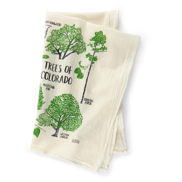 Learn about which trees live and grow in Colorado with this field guide tea towel illustrated by Claudia Pearson. It's screen printed by hand on 100% flour sack cotton.