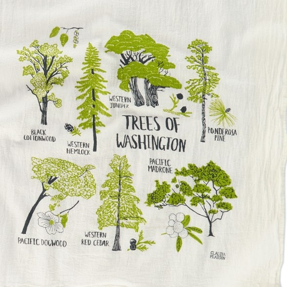 Learn about which trees live and grow in Washington state with this field guide tea towel illustrated by Claudia Pearson. It's screen printed by hand on 100% flour sack cotton.