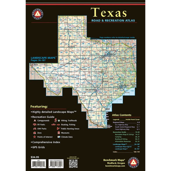 Explore the expansive Lone Star State with this Benchmark Maps atlas. It features Landscape Maps™ that reveal back roads and landforms. And its Recreation Guide will help you plan an adventure.
