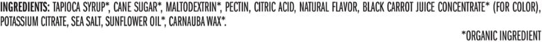 Strawberry: Tapioca Syrup*, Cane Sugar*, Maltodextrin*, Pectin, Citric Acid, Black Carrot Juice Concentrate* (For Color), Natural Flavor, Potassium Citrate, Sea Salt, Sunflower Oil*, Carnauba Wax*. *Organic Ingredient