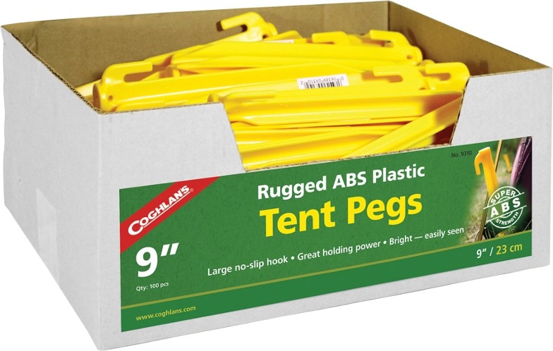 Coghlan 9 in. ABS tent pegs feature a rugged design and durable ABS plastic material. They are nearly indestructible!