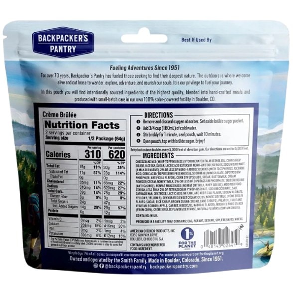 The Backpacker's Pantry Creme Brulee was a tasty treat that really did have a lot of that traditional Creme Brulee texture and flavor. Even the included crunchy sugar crystals mimicked a bit of a carmelized glaze. The taste and mouthfeel were both what you'd expect from such a dessert - just from a bag, instead. I did find it a bit challenging (even stirring vigorously) to get all of the powder and water thoroughly mixed. The pleats on the bag probably made this more challenging than anything, but still I encountered no unpleasant clumps of uncombined mix. The actually "cooking" couldn't be any easier, as you only need cold water - so, no heating is required. Some freshly filtered stream water would be a perfect source if out on the trail. I would strongly recommend that this be split amongst at least 2 diners - as it is exceedingly sweet. One person can choke it down, but it's a lot. If you're looking for most of the flavor of creme brulee - whether at home or on the trail - this will fit the bill and is pretty easy to boot.