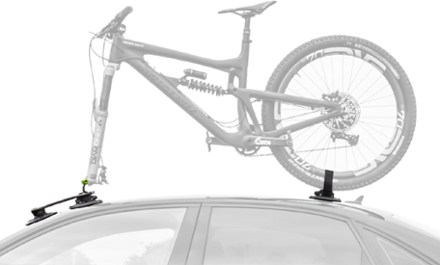 - 2-part rack includes a front mount with vacuum pads for the fork of the bike, and a separate mount with vacuum pads to secure the rear wheel