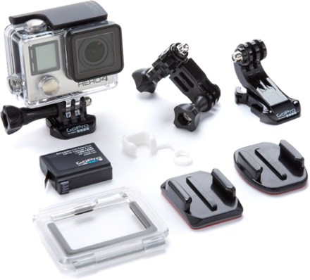 - Includes HERO4 Black Camera, skeleton backdoor, rechargeable battery, curved and flat adhesive mounts, quick release buckles, pivot arm and hardware, USB cable