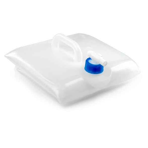 The GSI Outdoors Folding Water Cube holds 5.3 gal. (20 liters) of water and features an ergonomic tap handle that delivers a high flow rate for filling water bottles and washing dishes.