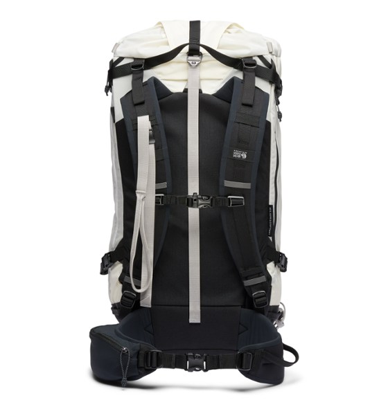The white cordura soaks up water like a sponge, which leads me to almost never use the thing for fear it may precipitate or be placed on wet ground The side straps don't fully tighten to compress the pack, so if not loaded up it flaps around The top flap is pointless and gets in the way It packs "out" rather than "up" so if fully loaded you get pulled backwards All around needs more R&D from people in the field not the factory Source: professional mountain guide