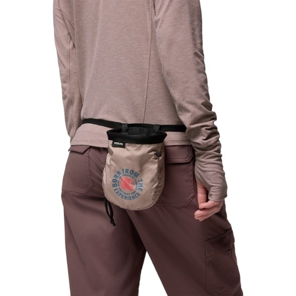 Head to the crag. This prAna chalk bag is built to fit your climb. It has a fleece lining and double-belt loops for stability. The adjustable drawstring keeps it closed.