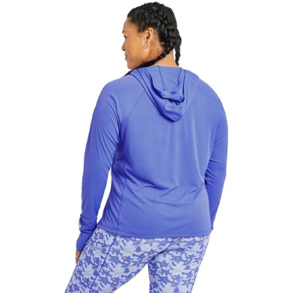 Stay cool and protected on longer training sessions with this Oiselle UPF 50 performance hoodie. The hood features a ponytail port. Both sleeves have watch windows and thumbholes.
