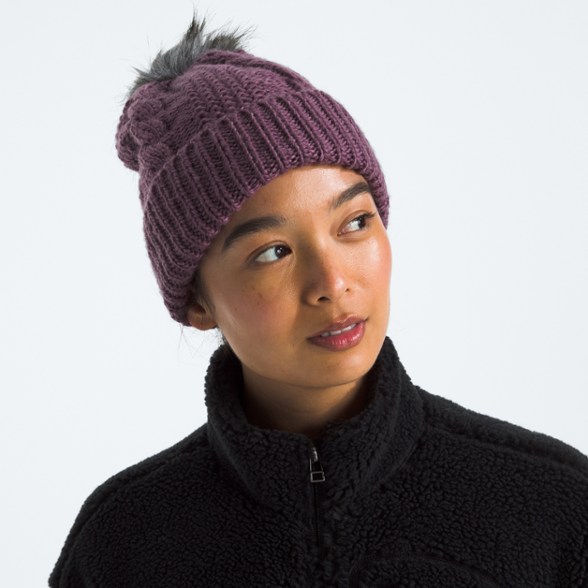 Keep your head warm in cold weather. This popular The North Face beanie features fabric made with recycled polyester yarn. It boasts an oversize pom and modern cabling.