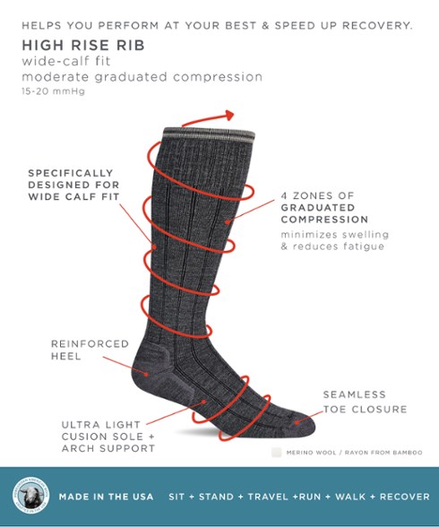 - Wide-calf fit with 15–20 mm HG graduated compression, which promotes circulation, minimizes swelling and reduces fatigue