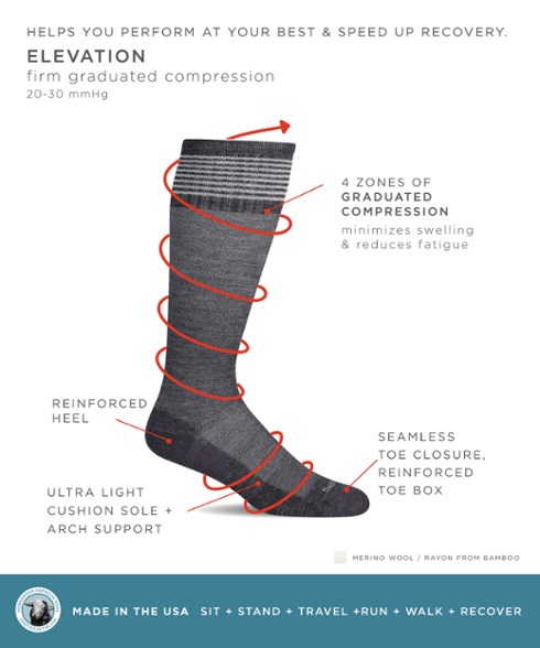 - 20–30 mm HG compression promotes circulation, minimizes swelling and reduces fatigue