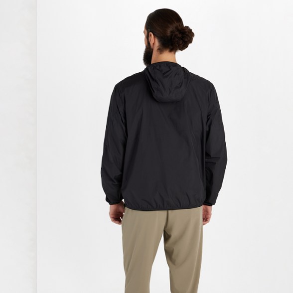 Outstanding product by all measures. Excellent in windy conditions and light rain either alone or as an added layer. Extremely comfortable with a generous fit if you want to wear it over a sweater. Built-in hood makes this jacket twice as useful. Great for travel and extremely easy to stow in its own pocket for any travel requirement. This is a WINNER and HIGHLY RECOMMENDED. Everyone should have one of these in their outdoor gear wardrobe.