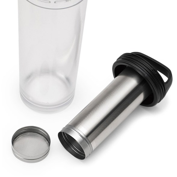 - Threaded plastic lid with a detachable stainless-steel infuser