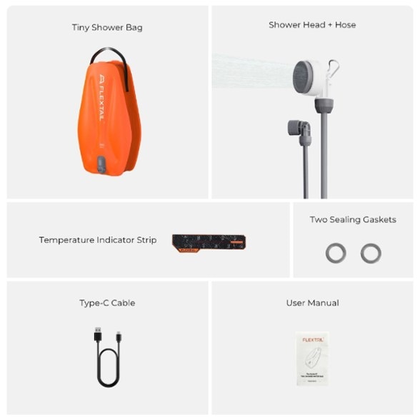 - Includes 20-liter shower bag, showerhead and hose, 1 temperature indicator strip, 2 sealing gaskets, 1 type C charging cable, and user manual
