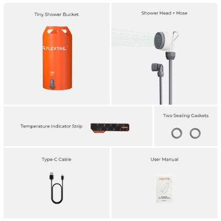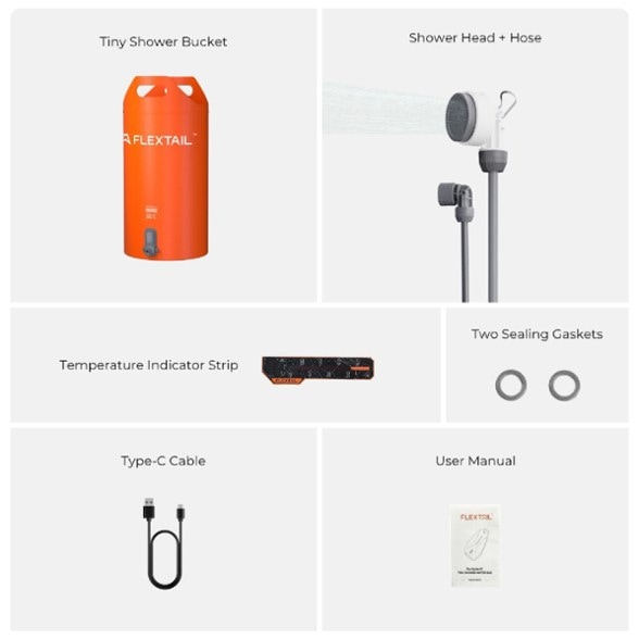 - Includes 20-liter shower bucket, showerhead and hose, 1 temperature indicator strip, 2 sealing gaskets, 1 type C charging cable, and user manual