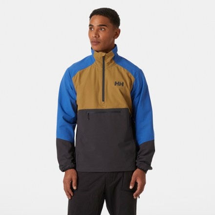 Get protection for wind and light rain with this Helly Hansen anorak. It combines the shielding capabilities of a soft shell and the warmth of a fleece. The front zippered pocket keeps items close.