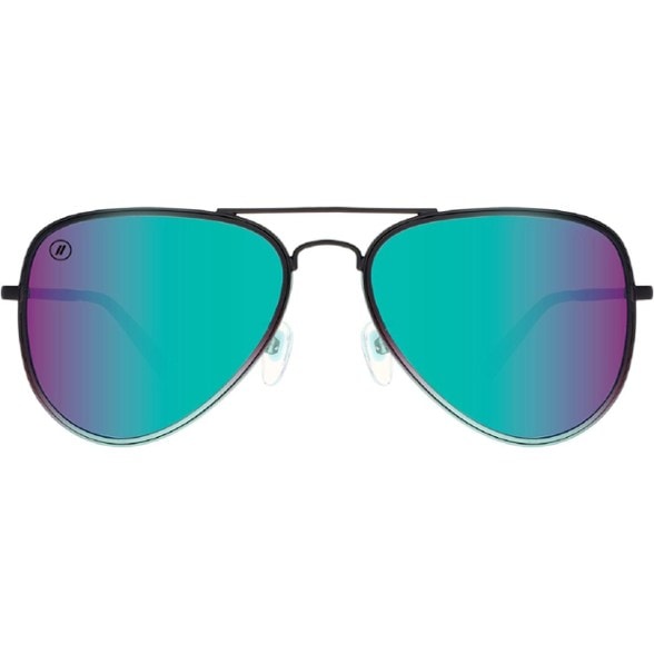 Planet Nine: Polarized blue mirrored lenses reduce glare for crisp vision on water, snow and pavement. Stainless-steel frame with matte black fade-to-light blue finish and nebula-inspired gradient.